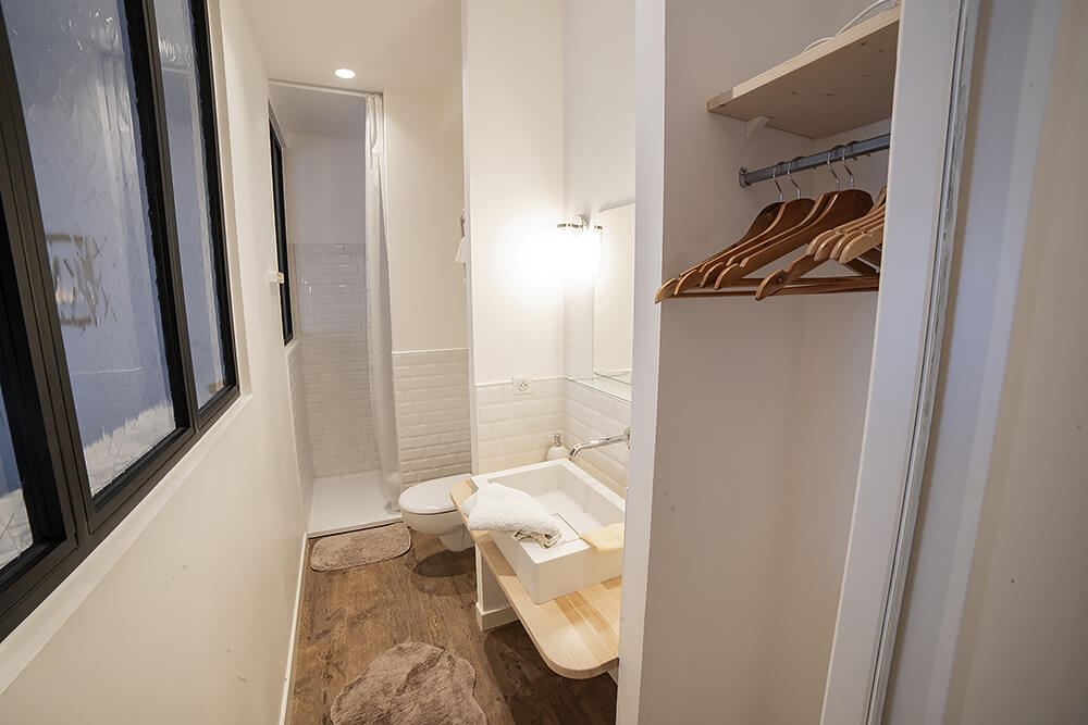 La chambre dispose d’un lit Queen size (160×200 cm), d’une salle de bain privative en verrière avec grande douche, toilettes, lavabo, sèche-cheveux, serviettes et gel douche fournis. Une fenêtre orientée est offre une belle lumière naturelle dès le matin et aucun vis-à-vis ne perturbe votre intimité.